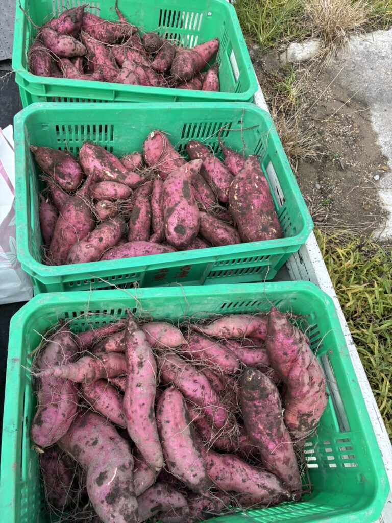 中腰での作業はなかなか大変でしたが、1列掘っただけでキャリー5ケース分のサツマイモが収穫できました。