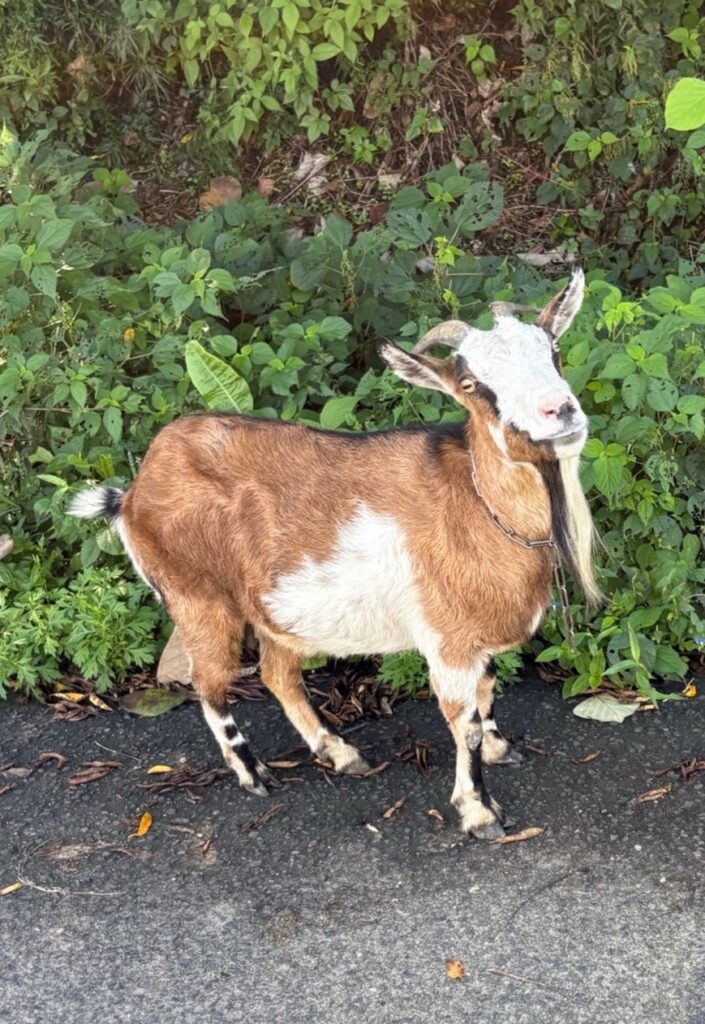 話は変わりますが、ファームへむかう山道の途中で、かわいらしいヤギがお散歩中でした。