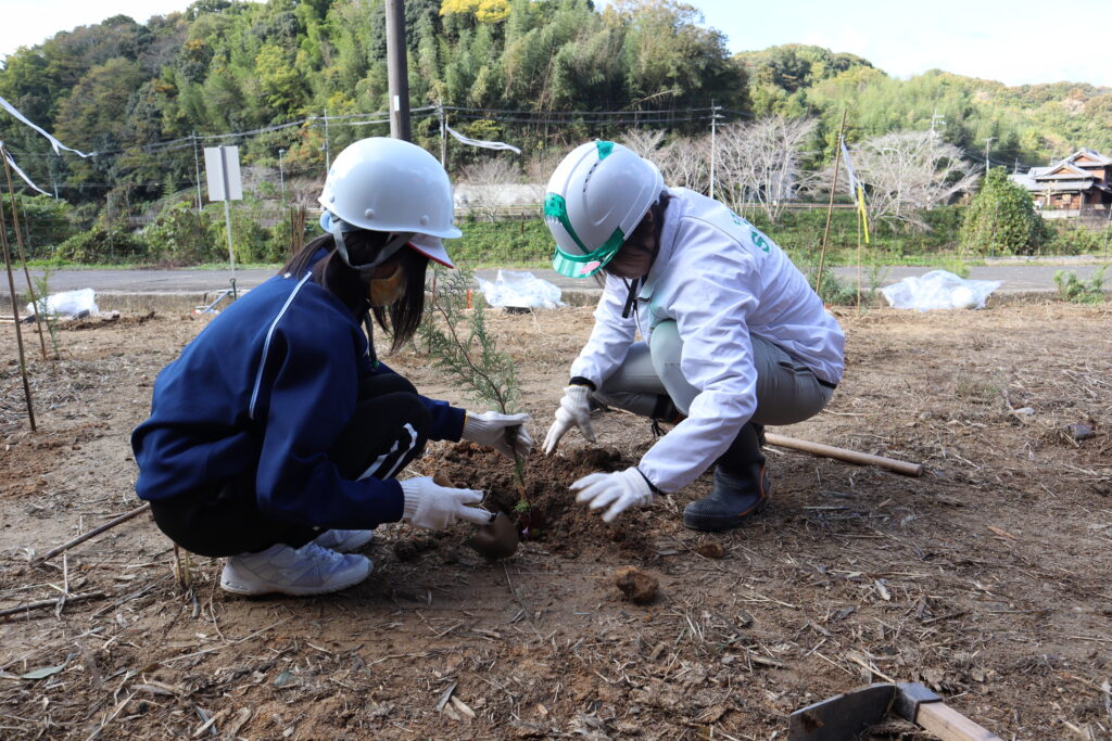 その後、財田小学校の5年生の皆さん、寄付企業の皆様とともに、ヒノキ100本、一本一本心を込めて苗木を植えました。