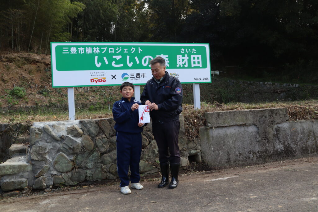 今回の植樹地の名称は、三豊市内の小学生から公募を行い、見事大賞に選ばれたのは財田小学校5年生の稲田惟人さんによる「いこいの森 財田」。
